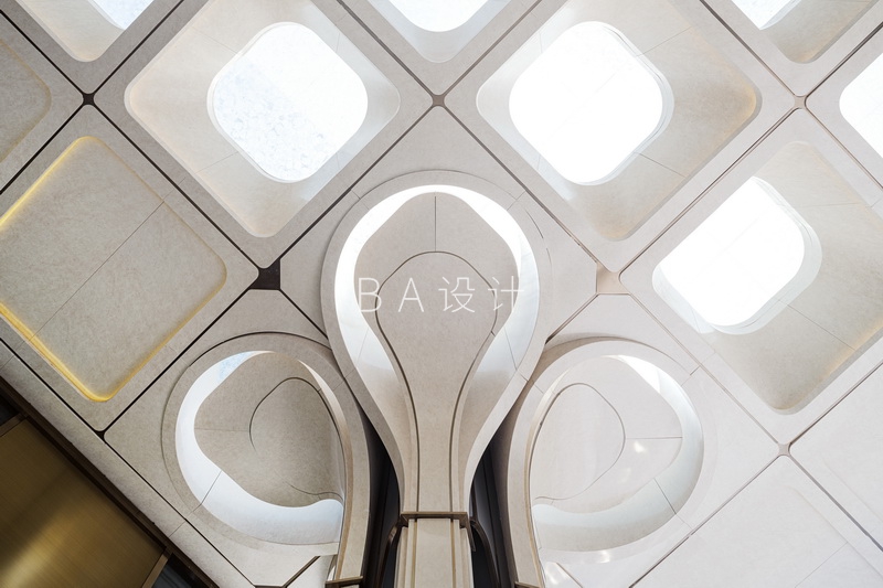 项目以“桂韵书香”为设计母题,将千年庐州书院文化凝练为建筑语言。BA意在营造摩登奢华的场景化归家体验,入口处70米“城市文化玄关”,通过光影层叠的超尺度立柱,曲面与体块的穿插设计演绎“万卷书简”意象。9米通高的美学馆设计与下沉式泛会所集群突破传统功能边界,打造集艺术展览、文化沙龙、云端书阁于一体的“垂直文化综合体”。