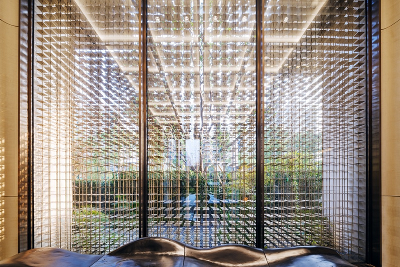 主入口横跨40余米,以16根“澄月玉树”巨构花瓣柱、双曲面铝板吊顶及3.5厘米厚艺术玻璃,演绎光影与材质的摩登对话。三万片古铜色不锈钢片组成金属片墙,在虚实掩映中强化空间节奏。项目不仅展现绿城品牌新标杆,更以极致营造工艺诠释现代都市中的宁静归所。