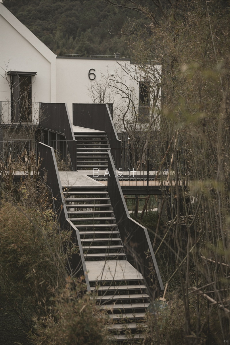 项目用地内有山有田,地形丰富,和现代建筑风格非常契合,但也因复杂多变的山地条件,在设计时也下了一番功夫:山地道路施工难度大,以最小的工程量设计园区内道路;排布车位避开大坡度路段;统筹南向采光面和景观面,着重注意北坡和侧坡上的户型;利用地形做出建筑高差关系,最大化利用景观面;考虑人行入户道路与人行组团路的关系,优化入户体验。